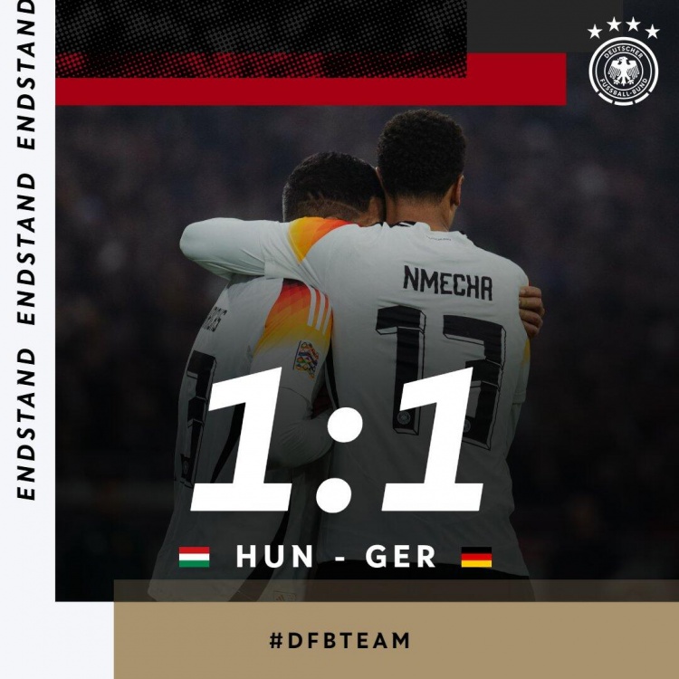 11月20日讯 北京时间11月20日03:45,欧国联A级别德国挑战匈牙利的比赛,上半场双方均无建树,努贝尔献精彩扑救,下半场哈弗茨替补出场抽射中柱,努贝尔扑沃尔高单刀,恩梅查补射打破僵局,科赫补时送点,索博斯洛伊点射绝平,最终德国1-1匈牙利头名晋级八强。