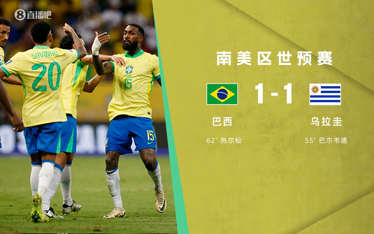 南美第5年度收官!巴西1-1乌拉圭,巴尔韦德热尔松对轰世界波
