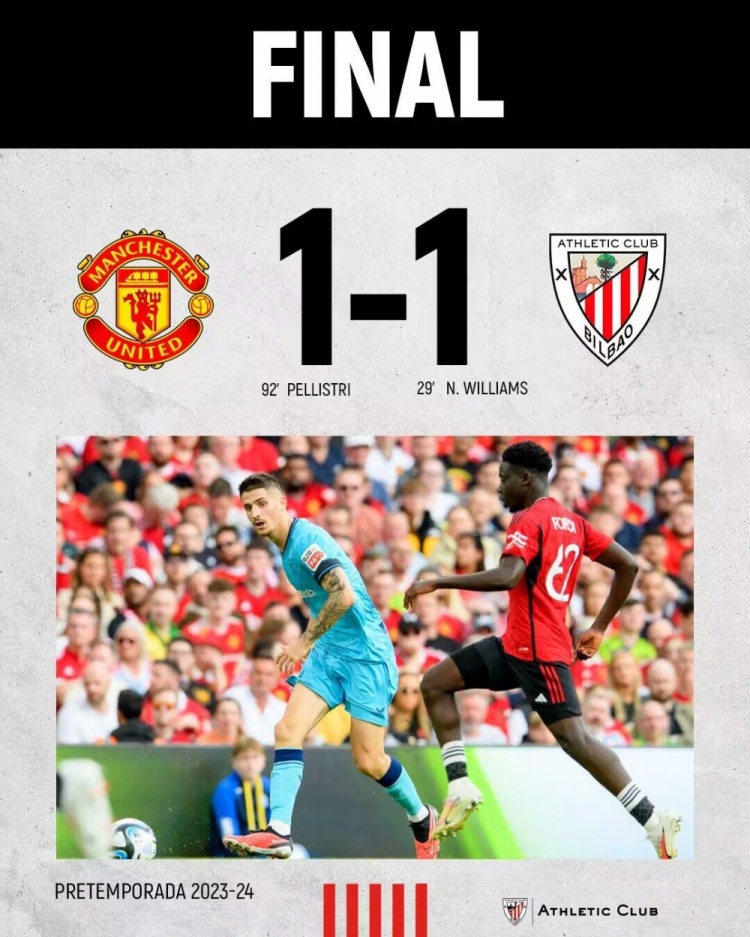 直播8月7日讯 北京时间8月6日晚上23:00,曼联与毕尔巴鄂竞技进行一场友谊赛。上半场,马奎尔送礼致尼科破门。下半场,帕雷德斯直红被罚下,佩利斯特里92分钟绝平。全场结束,曼联1-1毕尔巴鄂竞技。