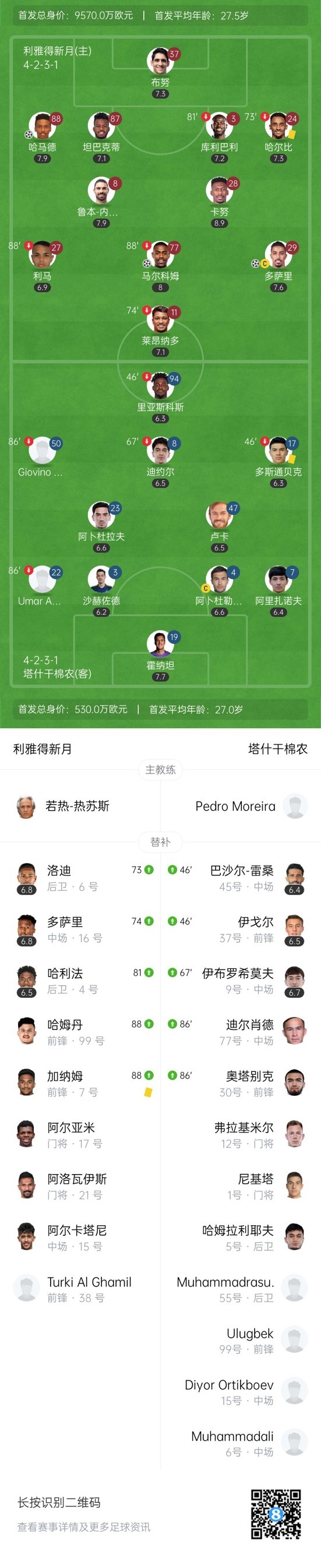 第30分钟,新月首开记录!卡努左路禁区接直塞球挑传到后点亚米头球破门,新月1-0塔什干棉农。↓