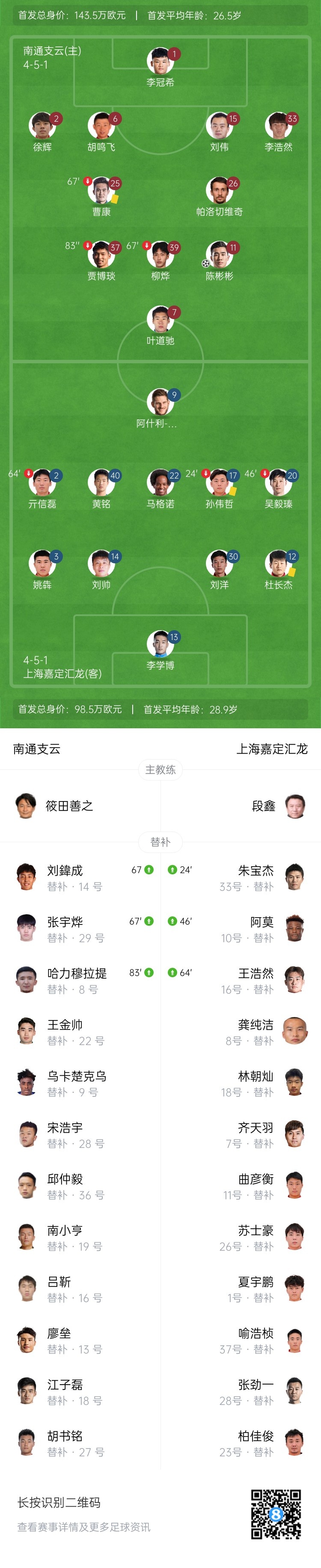 第32分钟,南通支云角球开出,多人头球接力后由贾博琰顶进,不过他越位在先,进球无效。↓