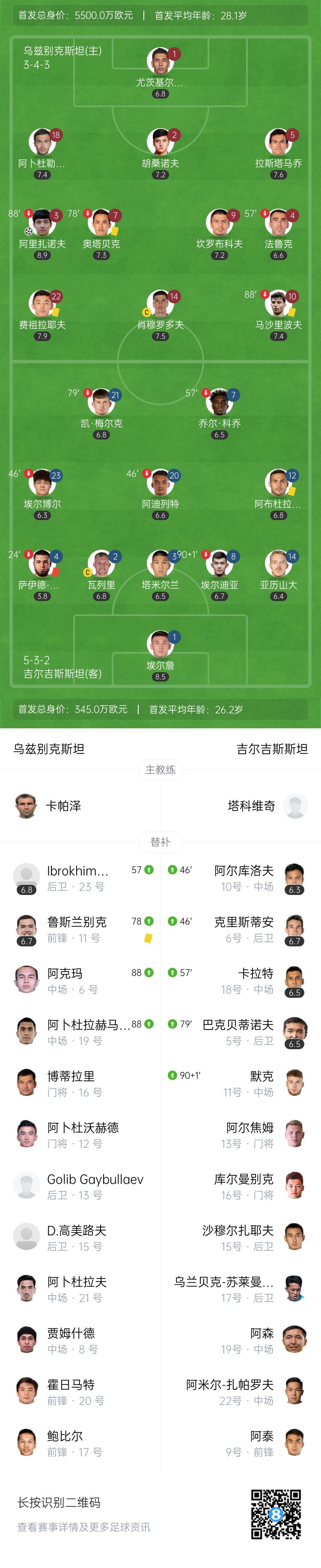 伤停补时8分钟。全场比赛结束,乌兹别克斯坦1-0吉尔吉斯斯坦。