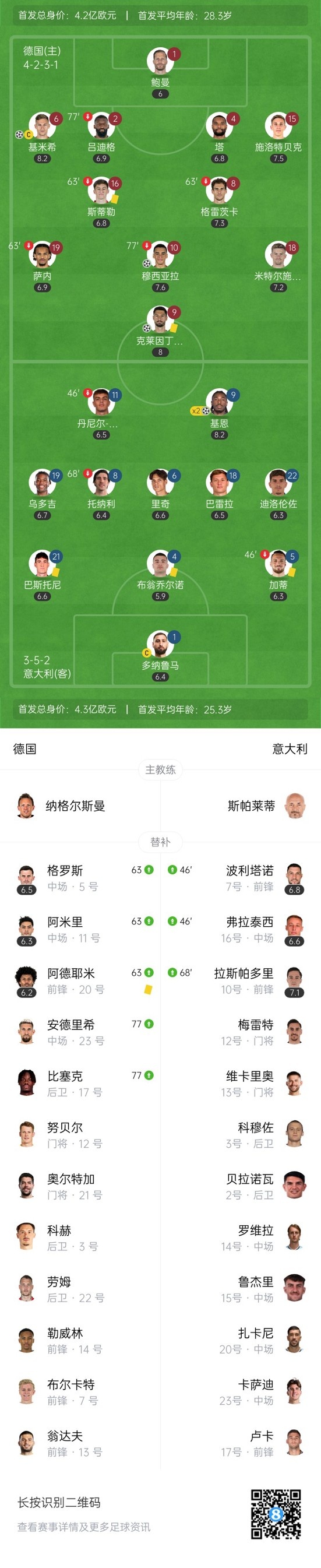 第35分钟,德国扩大比分!右路角球突袭快发到禁区穆西亚拉门前推射破门,德国2-0意大利。↓