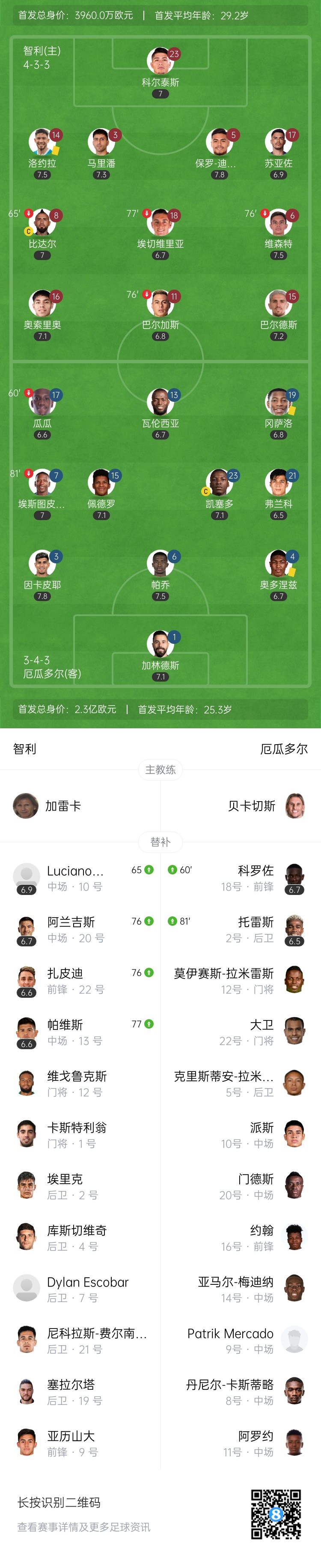 第89分钟,智利任意球开出,巴尔德斯后点端射被门将飞身没收。↓