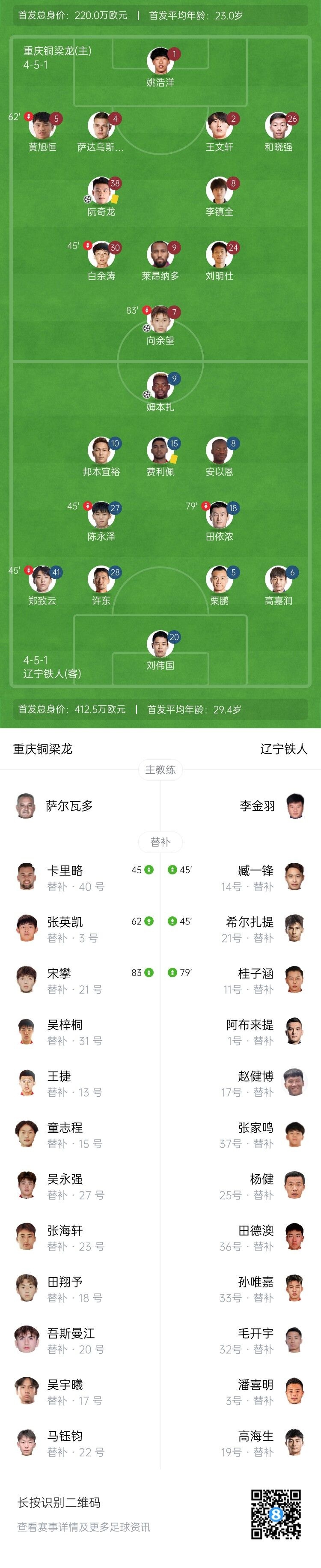伤停补时4分钟。全场比赛结束,重庆铜梁龙2-1辽宁铁人。