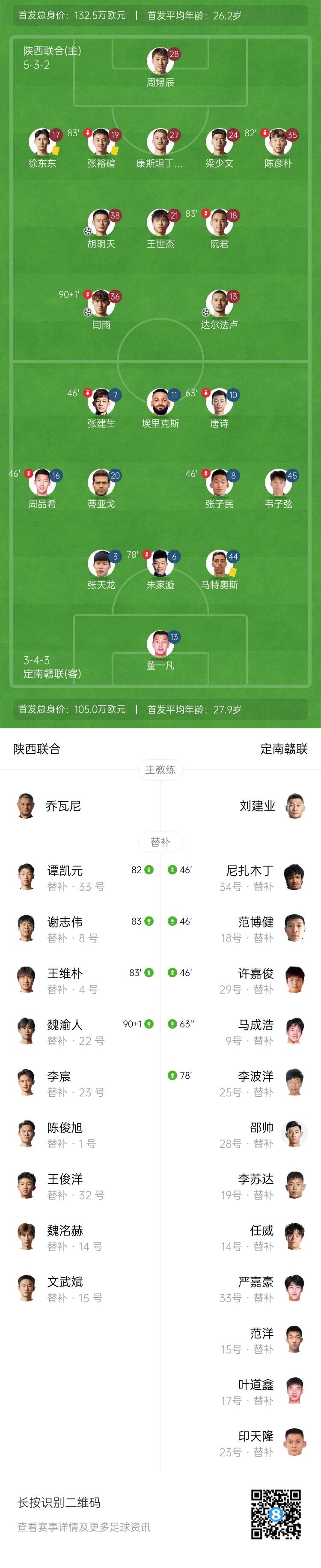 3月30日讯 北京时间3月30日下午15:30,中甲第2轮,陕西联合坐镇渭南体育中心体育场迎战定南赣联,本场观众多达21462人。上半场,达尔法卢打进陕西联合队史中甲首球,闫雨扩大优势。下半场,胡明天锦上添花,埃里克斯点射。全场结束,陕西联合3-1击败定南赣联,拿到队史中甲首球、首胜。目前陕西联合1胜1平积4分,定南赣联1平1负积1分。