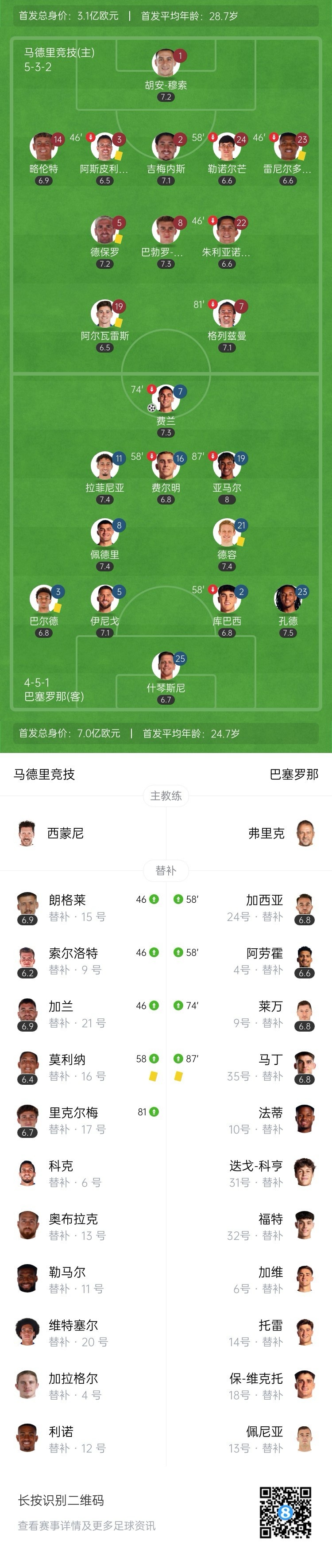费兰近4场攻入5球,亚马尔直塞助攻!巴萨客场领先!第27分钟,亚马尔送出直塞,费兰斜向跑位面对穆索抢射远角入网,马竞0-1巴萨!总比分巴萨5-4马竞!↓