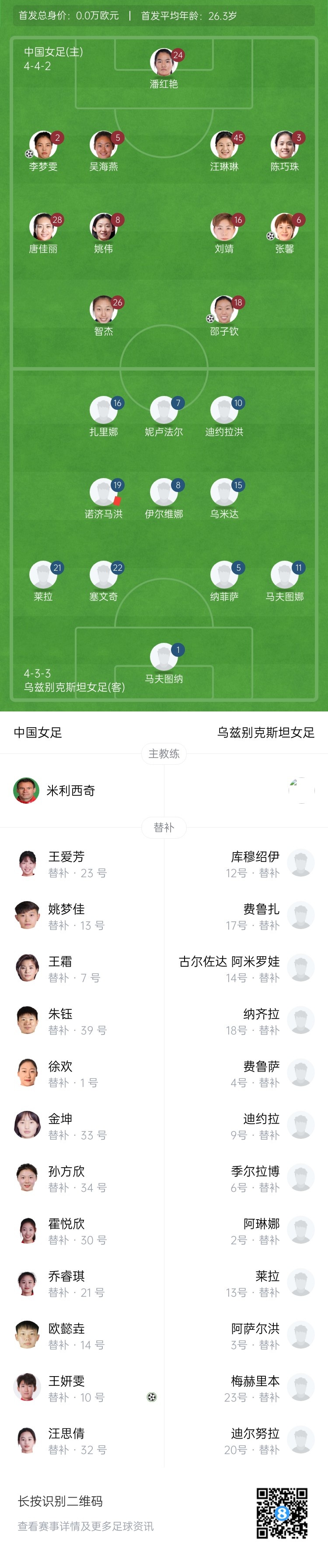 刘靖主罚点球命中,中国女足4-0乌兹别克斯坦女足。↓