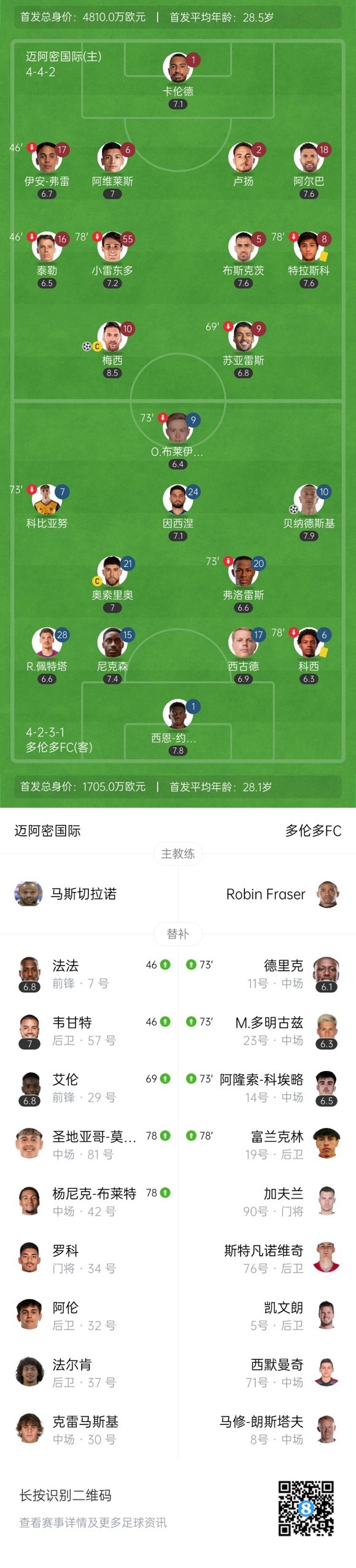 第46分钟,多伦多打破僵局!因西涅左路斜传禁区贝纳德斯基门前轻巧转身推射破门,迈阿密国际0-1多伦多。↓