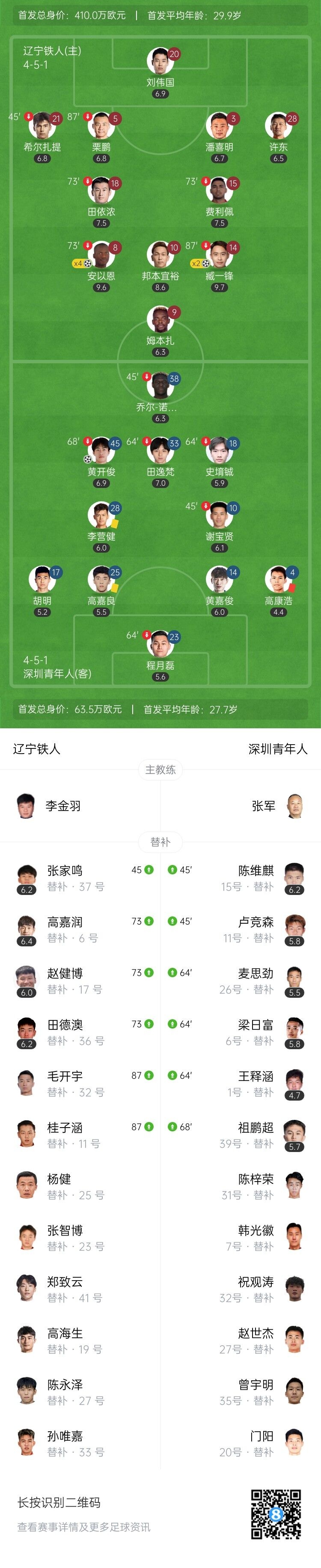 中甲-辽宁铁人7-1十人深圳 安以恩4射1传臧一锋双响高康浩直红