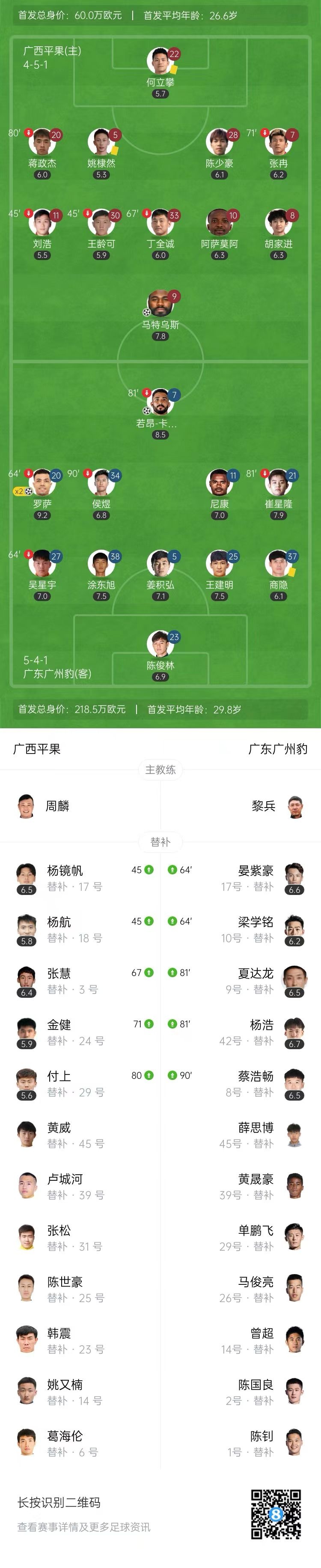 4月23日讯 北京时间4月23日19:30,中甲第5轮,广西平果坐镇主场平果国晶体育场迎战广东广州豹。上半场,若昂-卡洛斯门前抢点破门,随后助攻罗萨扩大比分。下半场,罗萨抢点再入一球梅开二度,马特乌斯铲射扳回一城。全场比赛结束,广西平果主场1-3不敌广东广州豹,开季至今五轮难求一胜。