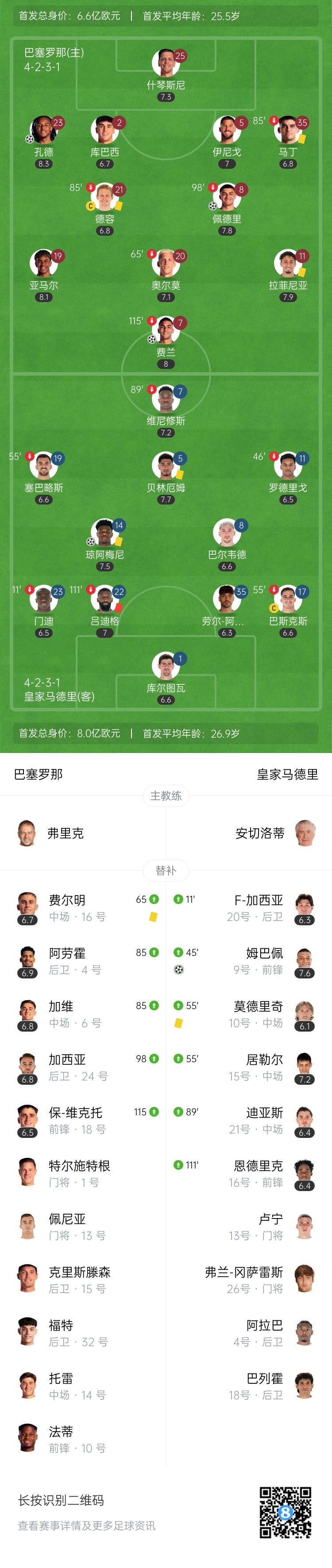 第28分钟,贝林厄姆出球被库巴西抢断,佩德里得球精准长传转移右路亚马尔,后者突入禁区稍作调整后回做,弧顶位置无人盯防的佩德里后插上远射破门,巴萨1-0领先↓