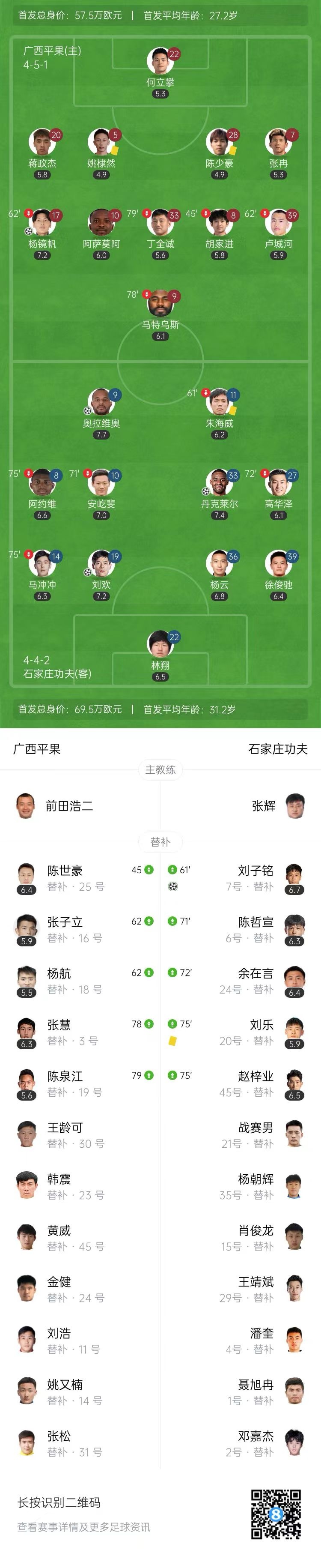 第61分钟,刘欢主罚前场禁区外任意球,起脚打门打在防守球员身上发生变线入网,石家庄功夫扩大比分,3-1!↓