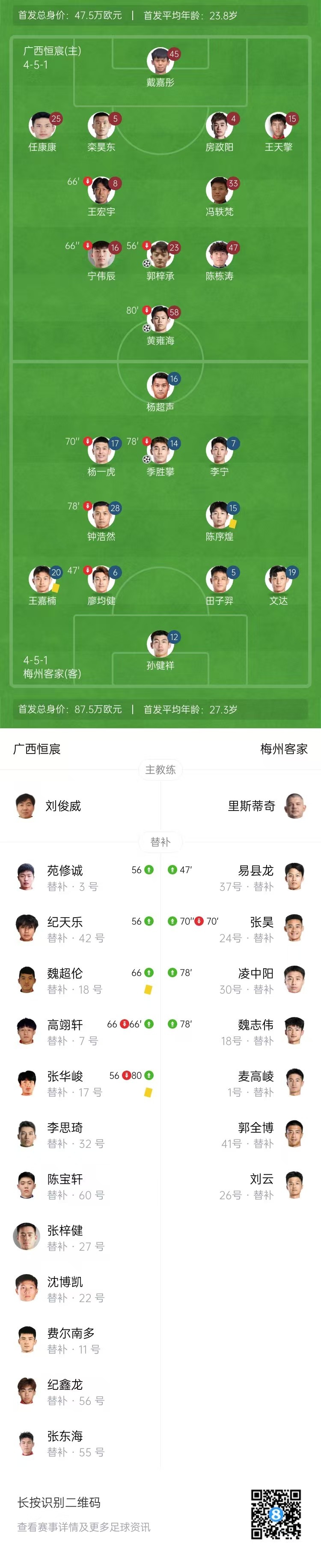 第72分钟,梅州后场解围失误,黄雍海策动进攻,第一下打门被扑,黄雍海补射完成反超,广西恒宸2-1梅州客家。↓