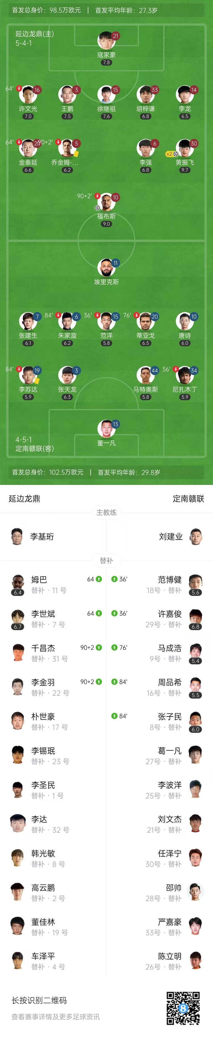 中甲-延边龙鼎3-0送定南赣联6轮不胜 黄振飞梅开二度福布斯破门