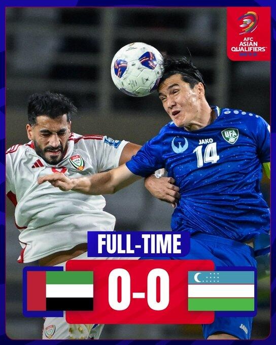 全场比赛结束,阿联酋0-0乌兹别克斯坦。