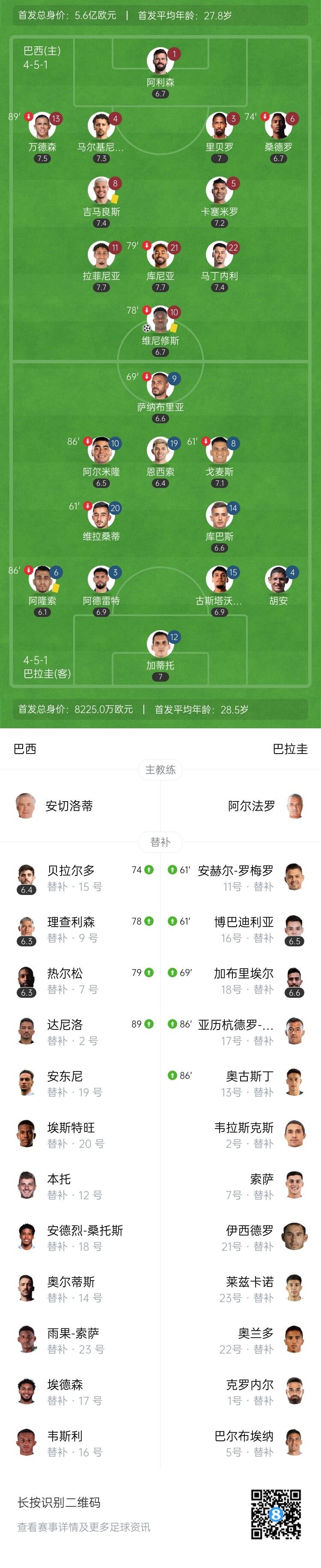 第75分钟,维尼修斯在突破中受伤倒地,随后他被理查利森替换下场。↓