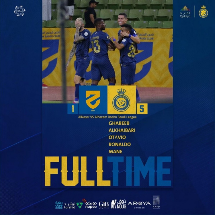 利雅得胜利首发:44-阿奇迪、2-哈纳姆、4-法蒂尔、27-拉波尔特、13-科南(75'14-纳吉)、17-哈巴利(81'21-A-玛卡塔)、25-奥塔维奥(75'15-特莱斯)、77-布罗佐维奇(81'19-哈桑)、29-加里卜(81'11-加纳姆)、10-马内、7-C罗
