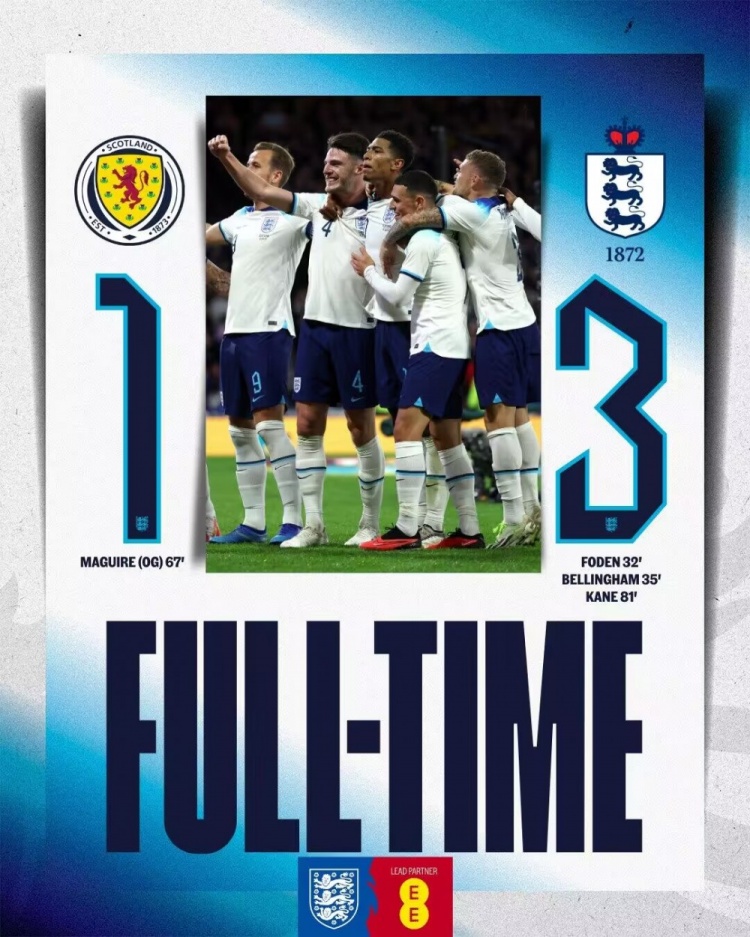 9月13日讯 北京时间9月13日02:45,国际友谊赛苏格兰对阵英格兰的比赛,上半场沃克助攻福登破门,贝林厄姆推射扩大比分,下半场马奎尔替补上场打进乌龙球,凯恩低射破门,最终英格兰3-1苏格兰。