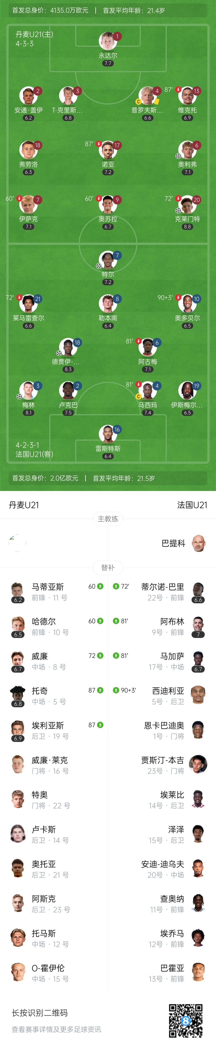 6月23日讯 欧青赛1/4决赛,法国U21对阵丹麦U21。上半场克莱门特-比斯霍夫为丹麦首开纪录,德贾伊-西塞扳平,法国U21暂1-1丹麦U21;下半场奥利弗-索伦森破门,特尔进球被取消,随后梅林进球,特尔建功,最终法国U21以3-2逆转丹麦U21,晋级四强。
