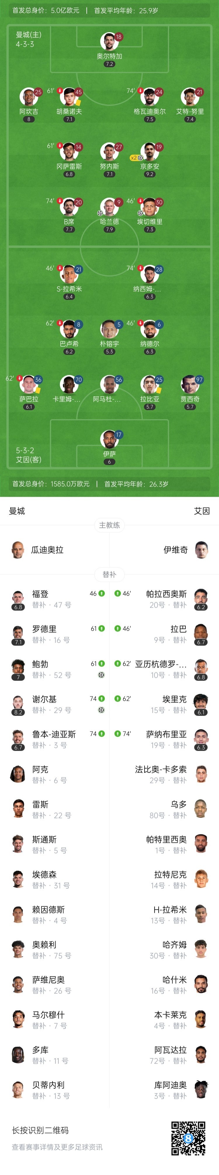 第84分钟,鲍勃禁区右侧内切,左脚迅速打近角!球进了!曼城5-0领先艾因↓