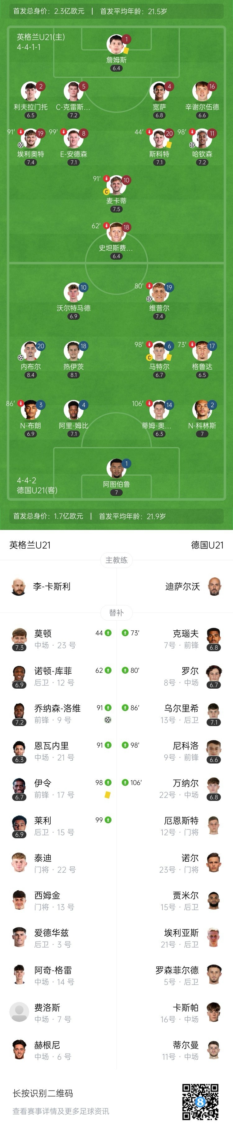 120分钟鏖战结束,英格兰U21 3-2德国U21。