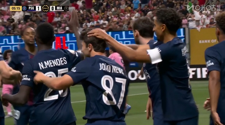 巴黎领先!若奥-内维斯破门,维蒂尼亚助攻!第6分钟,维蒂尼亚主罚任意球开出到后点,若奥-内维斯头球冲顶破门,巴黎圣日耳曼1-0迈阿密国际!↓