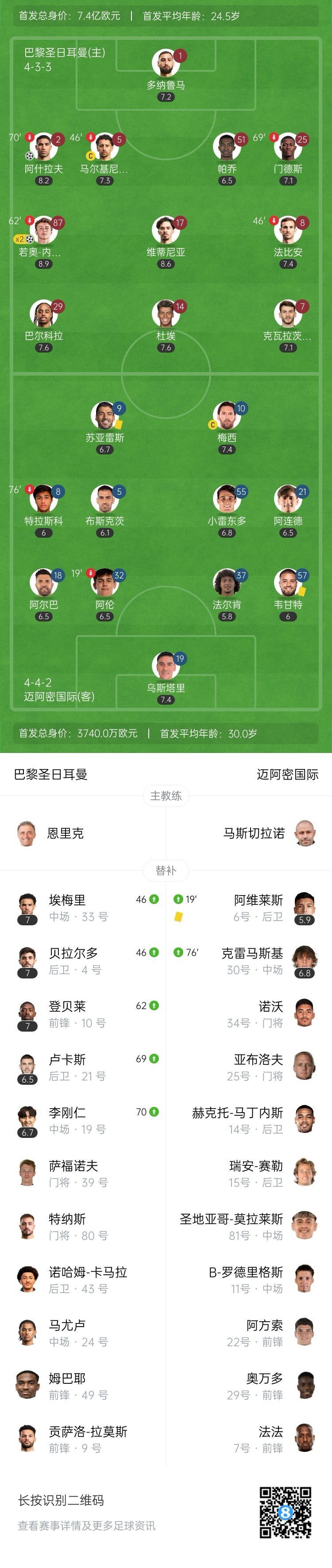 全场比赛结束,巴黎圣日耳曼4-0淘汰迈阿密国际晋级八强。
